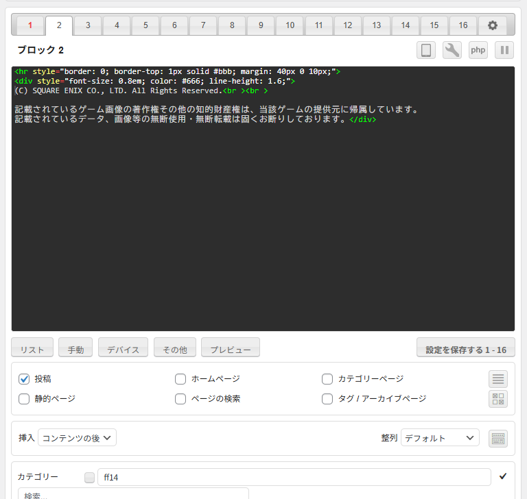 ※注意点:カテゴリがチェックマークの場合はそのカテゴリでのみ表示。×マークの場合は、そのカテゴリ以外で表示、になる - 「設定を保存する」を実行して保存。あとは以下の場合だと、FF14のカテゴリで表示。FF14以外のカテゴリでは表示されていないことを確認。
